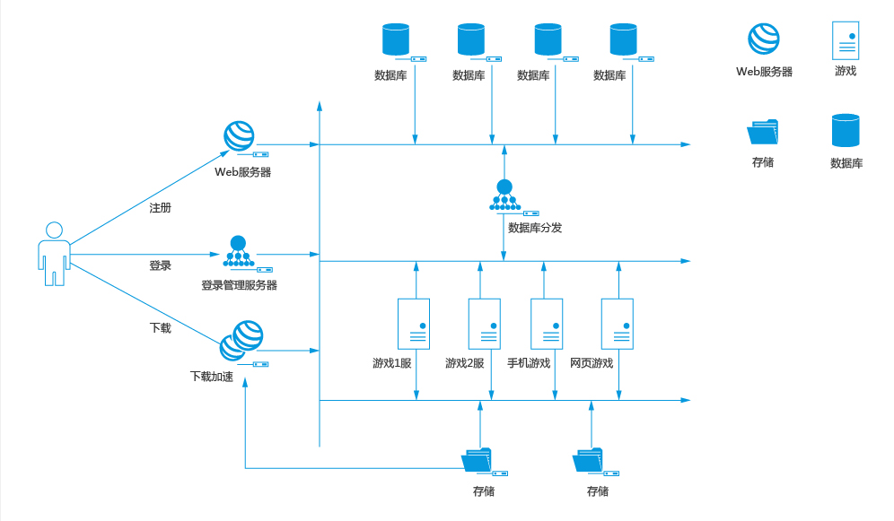 注 : 1.游戏服务器主要对数据库的负载较高,所以采用数据库负载均衡策略。 2.将客户端文件缓存到前端,加快用户下载游戏端的速度,使用户快速体验游戏。