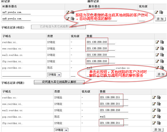 如果restdns.cc对应电信IP是221.130.200.210、网通服务器的IP是221.130.200.211;而邮局没有双IP,只有电信一个IP: 221.130.200.210 ;操作方法如下: